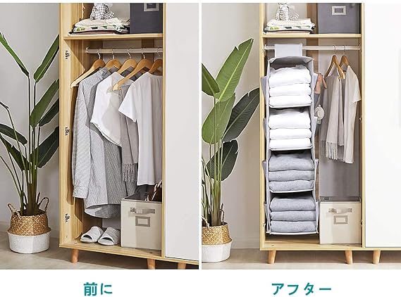 【収納力抜群】見やすく取り出しやすい4段で大容量の吊り下げ収納ラック、収納の心強い味方、両側にブラーや靴下などの12ポケット付き、幅広なので、収納力も抜群です。クローゼットのロッドに掛ける、だけ小物類からジーンズやベルト、帽子、靴箱迄収納られます。お好き次第自由にご愛用頂けます、毎日服を選ぶのが楽しくなります。
