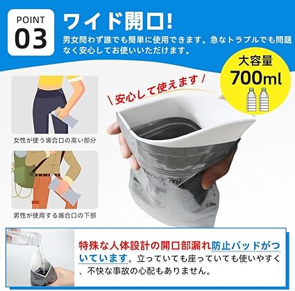 大容量700ccのポータブルトイレバッグは容量約700mlで、大人にとっては通常の尿量です。 2回以上使用できます。 また、病気や旅行中の嘔吐バッグとしても使用できます。
