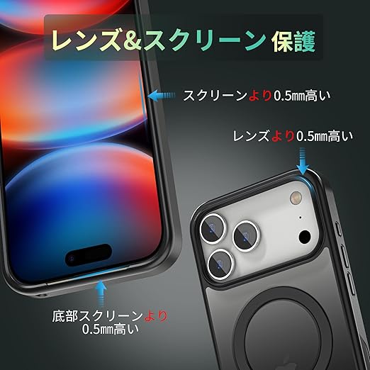 【360度回転可能・角度自由自在・半透明美学】 アイフォン17 Pro Max 用ケースの背面には、金属製造で360°回転可能なスタンドを革新的に設計されており、とても薄いのにしっかりとした造りで、好きな角度で固定できる。上下に 120°の多角度自由に調整できます、縦置きでも横置きでも安定して支えられます。仕事中のビデオ会議『縦置スタンド』、映画鑑賞『横置スタンド』、ゲームをしたり、写真を撮ったり、リングとしても利用で