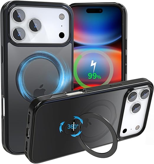 【超絶安定性ゼンマイ式】ハット iPhone 17 Pro Max用 ケース 360度回転スタンド 半透明感 耐衝撃 縦横両対応 マグネット搭載 [隠しスタンド&MagSafe対応&リング]アイフォン17 Pro max用 ケース 指紋防止 黄変防止 6.9 インチ ブラック a