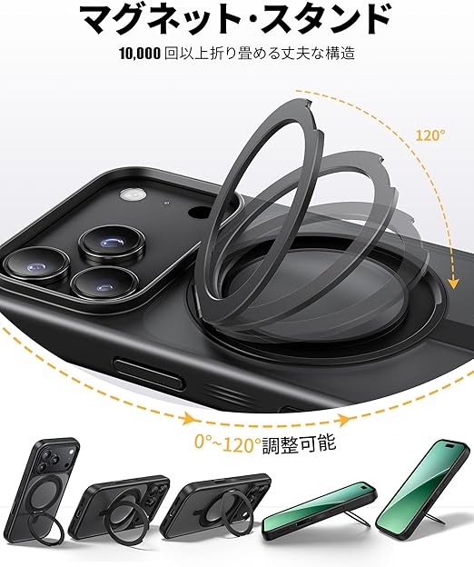 NIMASO iPhone 17 Pro Max 用ケース 縦横両対応 360°回転スタンドケース いphone17pro max用 MagSafeアクセサリー対応 カメラコントロールカバー 携帯スマホケース リングマグネット ワイヤレス充電対応 防指紋 米軍MIL規格 耐衝撃性 ストラップホール アイフォン17 プロマックス用 アジャスタブルスタンド ブラック(黒羽シリーズ)NSC25F1668 a