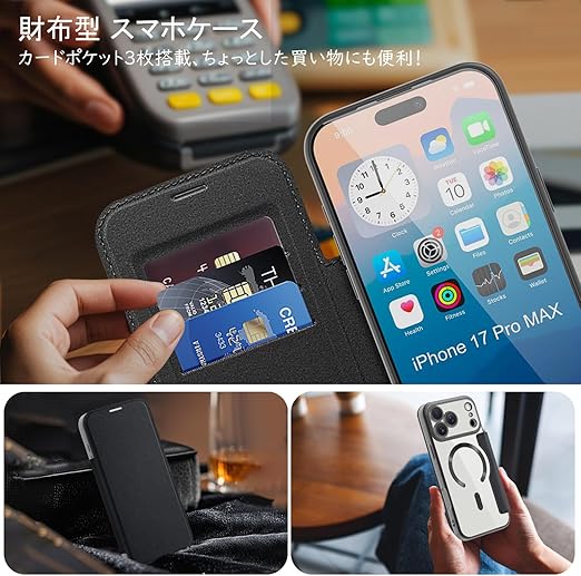 【REHOOF】iPhone 17 pro ケース 手帳型 magsafe対応 背面 透明 クリア 財布型 アイフォン 17 プロ ケース マグセーフ 手帳 ワイヤレス充電対応 カード入れ PU革 レザー スマホケース 軽量 薄型 防塵 耐衝撃 全面保護 スマホカバー(ブラック) a