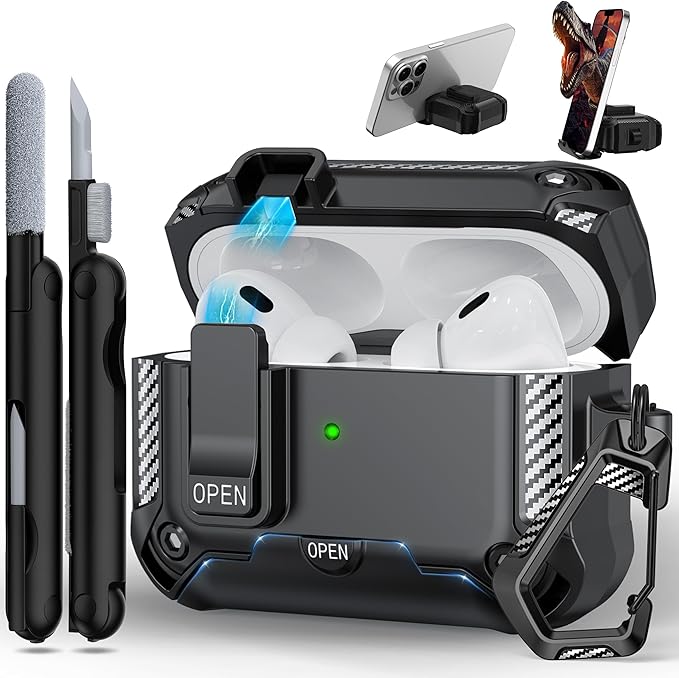 RFUNGUANGO Airpods Pro 1/2 ケース、AirPods Pro 第2世代ケース対応、クリーニングキット付き、電話ホルダー機能付き - ブラック a