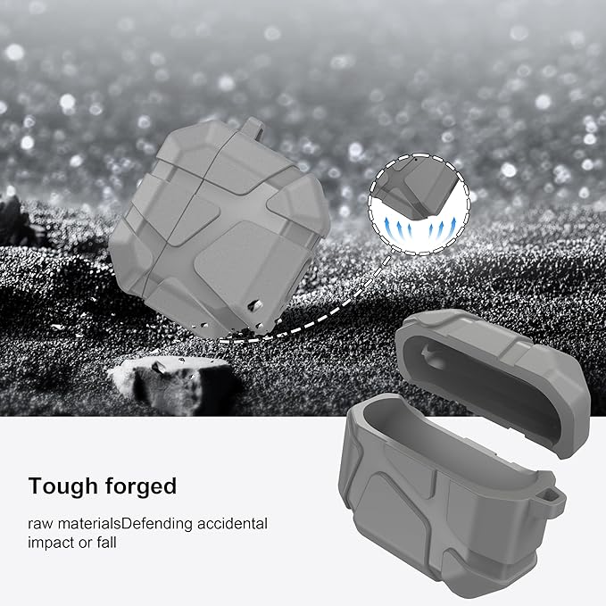R-Fun AirPods 4用シリコンケース 耐衝撃シリコン保護ケース AirPods第4世代対応 ハードシェルデザイン 傷防止 フロントLEDライト付き カラビナ付き グレー a