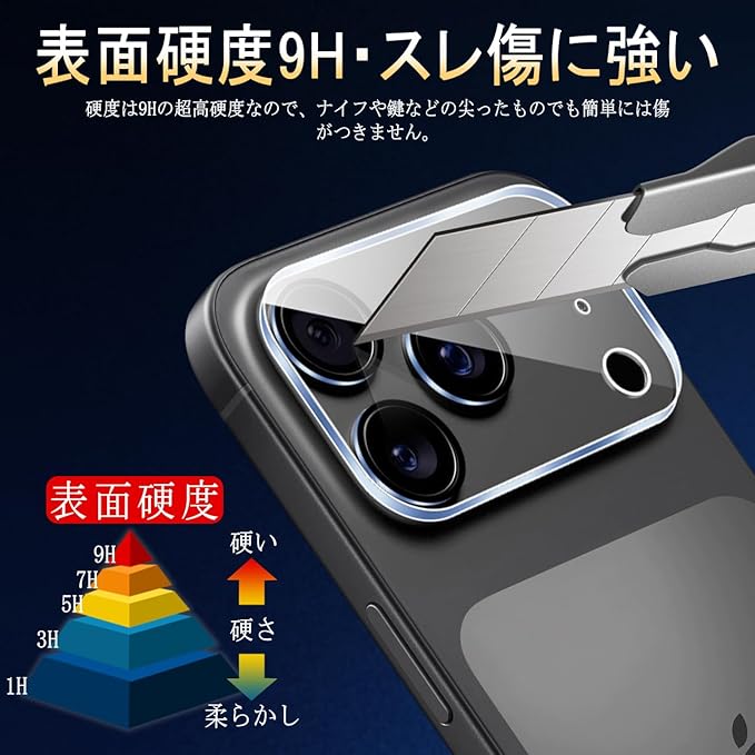【国産AGC旭硝子ガラス 素材】レンズ保護フィルム は国産AGC旭硝子ガラスを使っており、4.5時間の高温焼入れ処理して、強化を繰り返し、硬さは業界トップレベルの9Hに達しました。市販の通常製品の5倍の硬さに達し、ナイフなどの鋭いものでも傷しません。ハードコーティング技術を利用して、外部衝撃を吸収し、防爆性をアップして、外からの衝撃に簡単に吸収して、衝突されても、画面が壊れるリスクを 99% 減らします。更に 専用の強化ガラスフィルムは飛散防止加工を行っておりますので、万が一ガラスが割れても怪我を与えません。