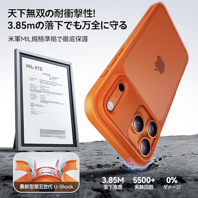 【米軍MIL認証済み・もしもの時も安心】米軍MIL規格「MIL-STD-810G」をクリアした強靭なiPhone 17 Pro 用ケース。四隅のU-Shock5.0と三層の耐衝撃構造により、3.85mの高さから5500回、36方向でアスファルトや砂利に落下させてもスマホ本体は無傷!日常使いから旅行まで、どんなシーンでも安心して使える。【365日安心保証】12時間以内に対応、安心してご購入ください!(購入履歴→購入商品→販売者→質問からご連絡ください)米軍MIL認証番号:GZMR220702237705