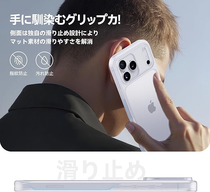 【滑り止め&指紋防止・すごく持ちやすさ】艶消しでマットな質感で手に持った時は背面が滑ることもなくフィットして、サラサラとした触り心地が最高のケース!また、側面の滑り止め設計により、滑りにくさが5倍向上し、持ち心地が従来品より63%改善。手にしっかり馴染み、滑り落ちる心配もない。特許取得済みの撥油塗装で、5年後でもさっぱりした質感を維持し、指紋の付着問題を完全に解消!マットな質感、触り心地、見た目、どれを取っても優勝!対応機種:いphone17pro ケース
