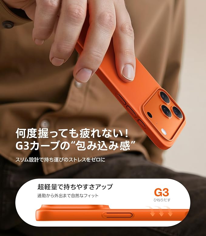 【上質なマット感と、さらりとした心地よい触感】精巧なナノコーティングが生み出す上質なマット感。普通のオレンジが、絶妙なマット質感を加え、見た目だけでなく、シルクのような滑らかさまで纏う。ケース表面にメタリックな光沢をプラスし、スタイリッシュで洗練された印象を与える。指先に伝わる上質なマット感とその触り心地はクセになる。さらっとした手触りで、手のひらに汗をかきやすい方でも長時間使用可能である。表面がベタつくこともなく、ティッシュで軽く拭くだけで清潔に保てます。ケースは肌に優しく、マット仕上げによってグリップ力を大幅アップする。日常使いでも、爽やかな滑らかさと落下しにくさを両立する。