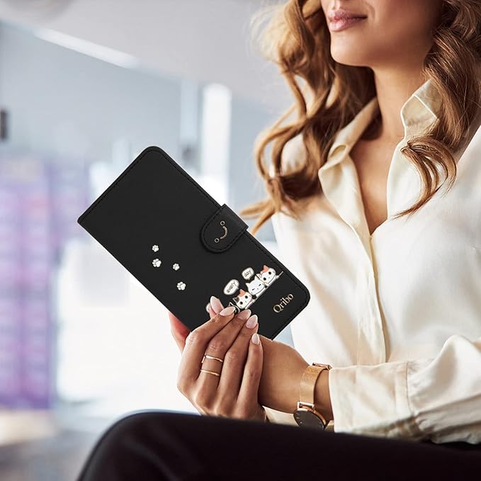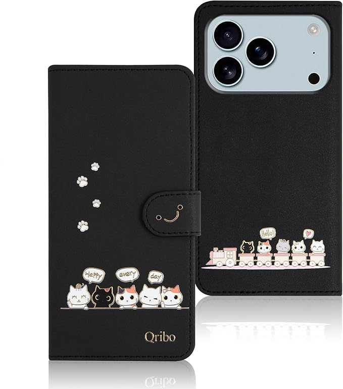 Qribo 適用の iPhone 17 Pro ケース 手帳型 いphone17pro 手帳ケース シンプルなのに可愛いデザイン エンボス加工猫柄 うれしい気持ち 6.3インチ対応 アイフォン17proケース iphone17プロ カバー iPhone17pro スマホケース 薄型 防水 の耐久性 滑り防止 美しい 贈り物 友達 - ブラック