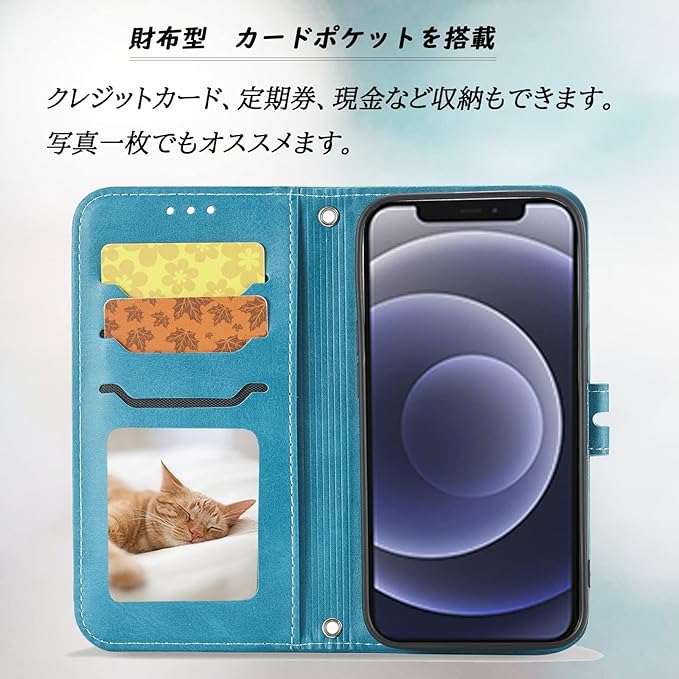 iPhone17Pro ケース 手帳型 iPhone17 Pro カバー あいふぉん手帳型 アイフォン 携帯ケース iPhonecase スマホケース スマホカバー 携帯カバー ストラップ付き カード収納 財布型 ベルトマグネット スタンド機能 かわいい 猫 耐衝撃 全面保護 (iPhone 17 Pro 対応) ターコイズ