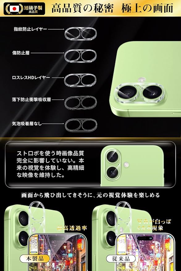 【日本旭硝子素材採用!圧倒的な耐衝撃性・飛散防止!】徹底的にこだわった品質、信頼できる日本製旭硝子素材を採用、通常カメラフィルム などと比べ、強度、耐傷性、質感のすべてにおいて優れた性質を持ちます。安心してご使用いただけるように、一
