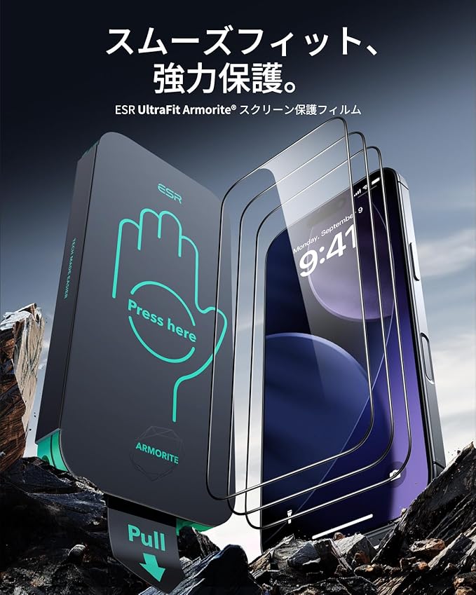 【3秒で完成・50kg耐衝撃】ESR ガラスフィルム iPhone 17 Pro Max 用 9H越え硬度 強化ガラス 米軍MIL規格保護 3枚 AR加工 さらさら 気泡無し 指紋防止 自動除塵 ホコリフリー SGS認定品 1.7M鋼球落下テスト 高耐久 いphone17promaxガラスフィルム 超簡単ガイド枠(UltraFitトレイ)付きAmorite保護フィルム