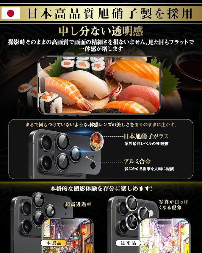 【日本製素材旭硝子製!超高硬度9H・飛散防止!】高いの光通過率を持っていて、フィルムを貼ったままでもトリプルレンズカメラの広がる表現力と細かな性能が全て対応できるので、撮影時に画質をそこなわなくて、被写体の