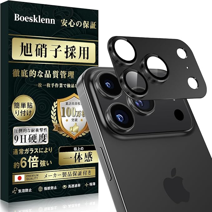 Boesklenn 対応 iPhone 17 Pro Max カメラ保護 対応 iPhone 17 Pro Max レンズカバー【ぴったりフィット一体感 アルミ合金+9H強化ガラス日本旭硝子素材製】全面保護/高透過率 17 Pro Max カメラ保護カバー ブラック