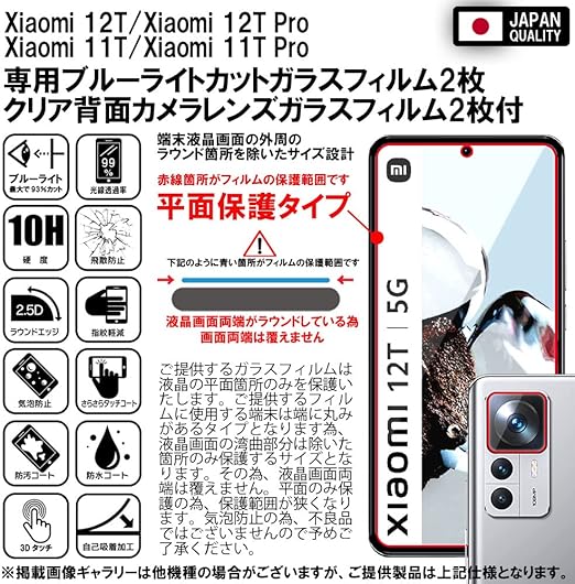 【対応機種及び仕様】Xiaomi 12T/Xiaomi 12T Pro ブルーライトカットガラスフィルム2枚+クリアカメラレンズ保護ガラスフィルム2枚セット。■ブルーライトカット率の高いガラス素材を使用。■安心の日本製素材 国産AGCガラスを使用。■第3世代製法の最新技術のW硬化製法(2次強化)ガラスで耐衝撃性を強化。