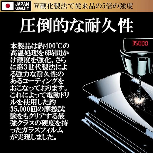 ■ガラス表面に400度の高温処理を6時間かけた強力コーティングを実現。■フィルムが破損しても飛散防止加工で液晶画面を徹底保護。■第3世代製法の最新技術のW硬化製法(2次強化)ガラ