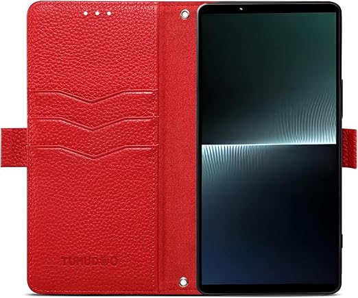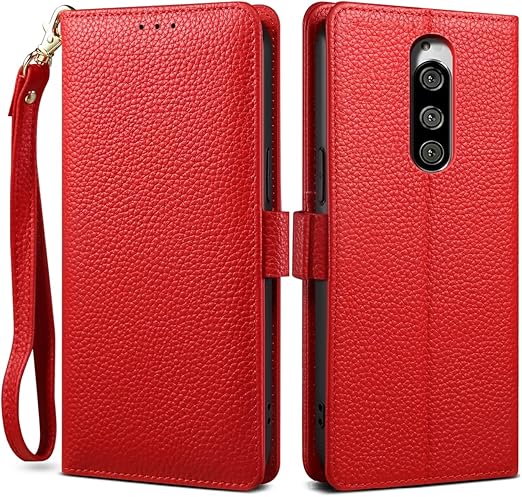 【2024 新登場! 高級シュリンクカーフレザー】Xperia 1 ケース 手帳型 本革 牛革 カード収納 サイドマグネット式 横置きスタンド機能付き 上下にストラップホール付き ストラップ付 エクスペリア ワン docomo SO-03L au SOV40 softbank 901SO 対応 ケース 柔軟なTPU素材 耐衝撃 全面保護[Noble Series](Xperia 1、レッド) a