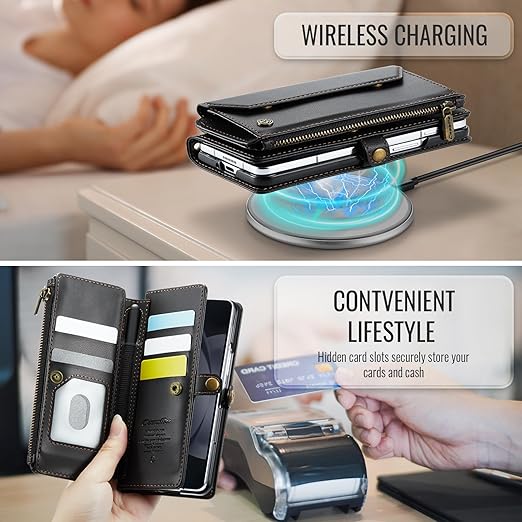 XIMAND for Samsung Galaxy Z Fold 6 ウォレットケース、6つのカードスロット、RFIDブロッキング、マグネット開閉、ジッパー、現金紙幣ポケット、プレミアムPUレザー、クロスボディリストレットストラップ、Sペンホルダー付き - ブラック a