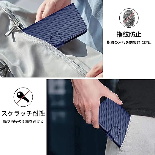 【上質な素材】このケースの外装は高品質のPU素材とカーボンファイバーの質感で作られており、手に馴染み、傷防止、指紋防止、優れた熱と衝撃吸収性を持っています。内側はソフトなTPU素材で携帯電話を保護し、着脱も簡単です。また、ケースは携帯電話