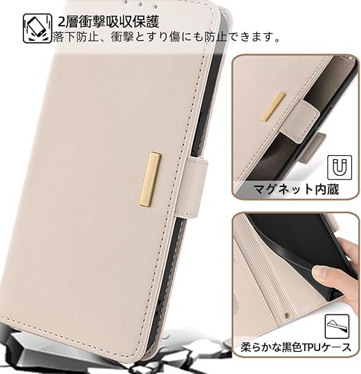 【機能性1:高品質PUレザー】外側のカバーには触感がとても良い高品質のPUレザーを採用します。内側のスマホホルダーは柔軟なTPU素材を採用したソフトケースです。耐衝撃の二重構造で落下の衝撃をうまく吸収し、本体をしっかりと守ります。フリップの表にゴールド色の金具を飾って、ユニークな高級感がアップします。