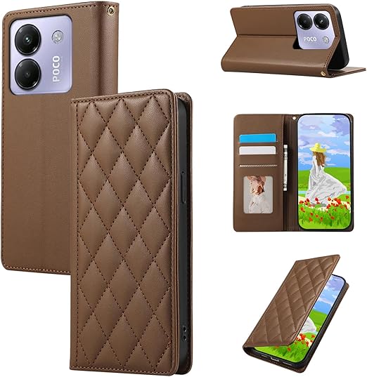 Gedurya POCO M7 Pro 5G 用 ケース 手帳型 シャオミ ポコm7プロ 5g ケース 携帯カバー RFIDブロッキング カード収納 財布型 Xiaomi POCO M7 Pro 5G スマホケース 6.67インチ対応 マグネット式 スタンド機能 全面保護 耐衝撃 ひし形 グリッド 刺繍 パターン - ブラウン a