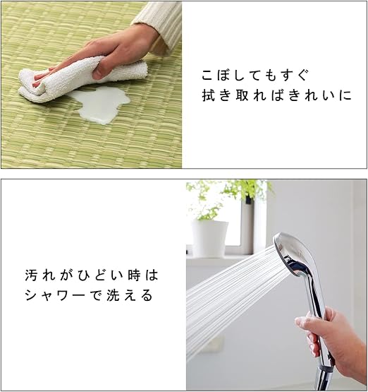 【仕様】サイズ:江戸間10畳(約435×352cm)、原産国:日本製(純国産)、素材:ポリプロピレン100%。ポリプロピレンとはプラスチックのひとつで軽くて傷がつきにくい丈夫な素材です。細いストロー状のポリプロピレンを、い草花ござと同じ要領で織り上げた汚れに強いカーペットです。