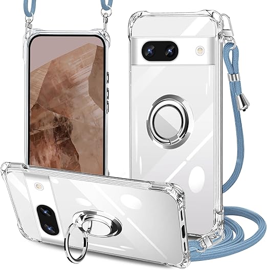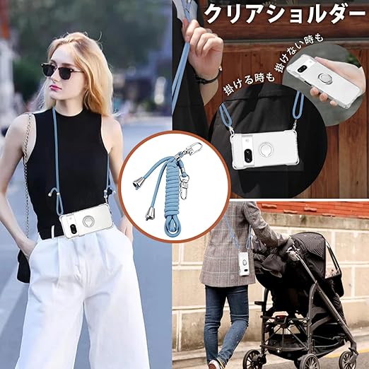 PAILAIMEN Google Pixel 8a ケース クリア ネック リング付き ショルダー pixel 8a ケース 耐衝撃 対応 ピクセル8a スマホケース 肩掛け 斜めかけ 縄掛けケース 透明 TPU ストラップ付き 携帯ケース 薄型 軽量 紐付き ネックストラップ ショルダー 肩掛け 縦/横 2WAY 長さ調整可能 取り外し可能 落下防止(縄掛け-アッシュブルー)