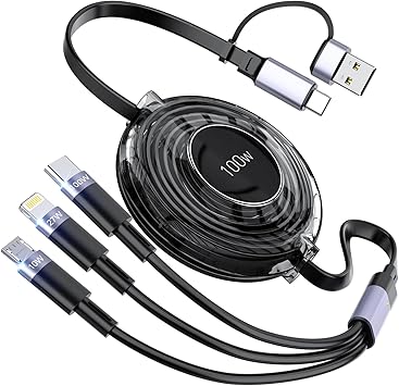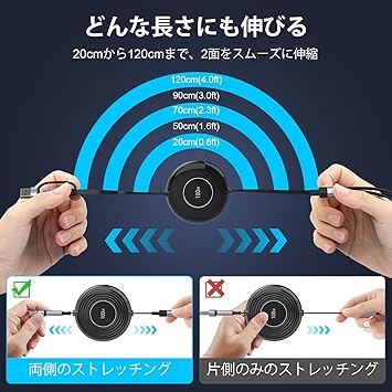 【100W】充電ケーブル 3in2 巻き取り式 充電コード 【PD対応100W/5A】超急速充電 LEDディスプレイ 超高耐久 データ転送 断線防止 iPhone15/16シリーズ充電ケーブル MacBook Pro/iPad Pro/Surface Pro/Asus/Google Pixel/Galaxy等タイプC対応-120cm ブラック