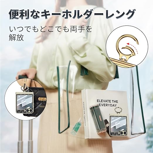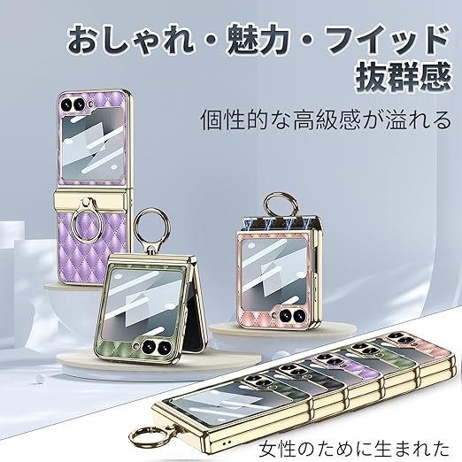 OURJOY Galaxy Z Flip6 ケース 格子 360°回転リング 磁気ヒンジ ストラップホール付き 強化ガラスフィルム 折りたたみ 全面保護 メッキフレーム ギャラクシー フリップ6 保護カバー スマホケース スタンド機能 ヒンジ保護 レンズ保護 おしゃれ・グリーン