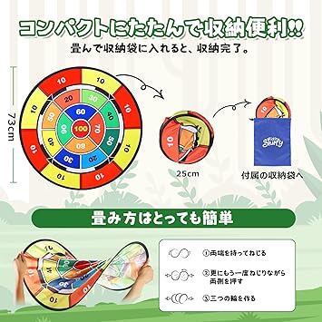 【超大判の両面式のターゲットボード付き】ターゲットボードの直径は73cmがあり、小さなお子様でも的に当てやすいです。さらに、両面とも遊び可能で、楽しさ倍増!また、折り畳み式で、持ち便利です。
