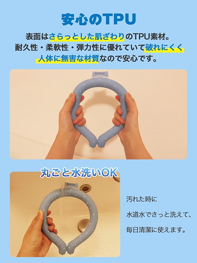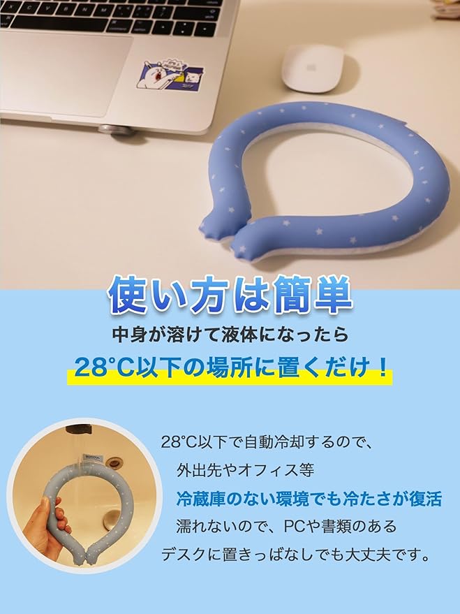 暑い真夏の季節でもリングはひんやりキープ!28度または24度以下の空間で凍る不思議な氷「PCM素材」で作られた首元用のネッククーラー。