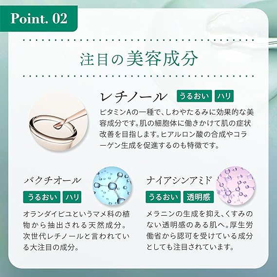【美容成分をふんだんに】次世代レチノールとも称されるバクチオールやナイアシンアミドといった注目の美容成分を配合