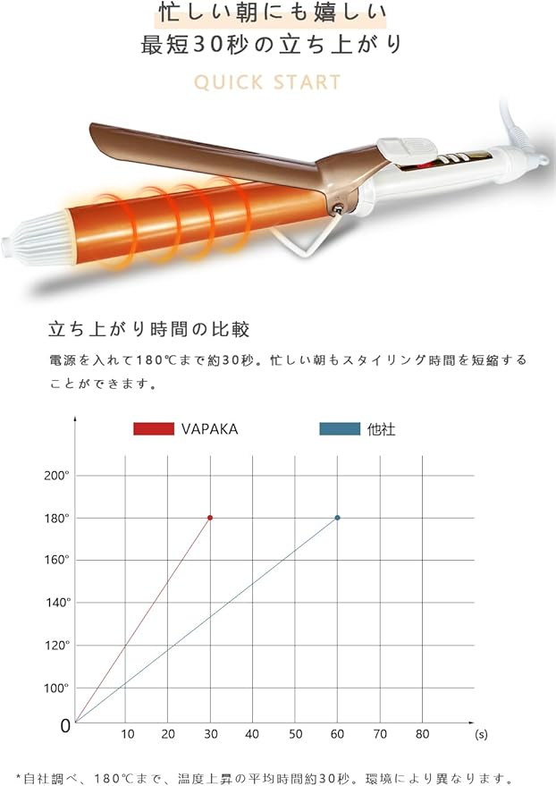 ■みずみずしく弾む目を奪うほど美しいカール§:最高温度230℃のプロ仕様で、60℃~230℃まで、10℃ごとに18段階で温度調整が可能です。髪質やヘアスタイルに応じて切り替えられるのが便利です。VAPAKAのカールアイロンは、髪をやさしく包み、均一に熱を伝えることでみずみずしく弾む立体的なカールを生み出します。毎朝のスタイリングはもちろん、大事なイベントの日、雨で湿気の多い日、デート、パーティ・・・髪をバッチリ決めたいシーンにしっかりとスタイルが決まる。