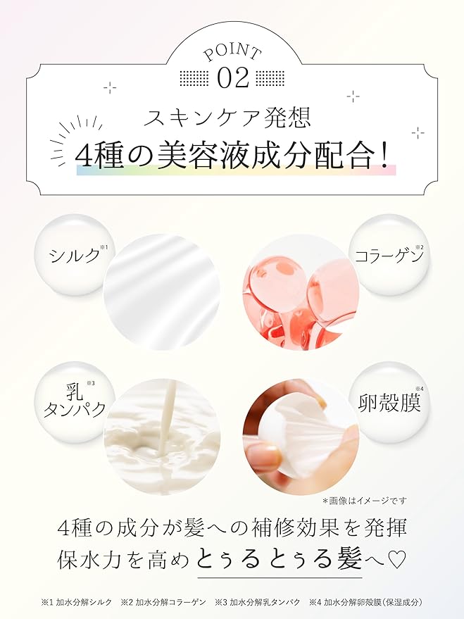 ダメージ髪の深部・内部・キューティクルまで浸透し、たっぷり保湿して集中補修。高保水プロテイン(*1)が髪の内部に浸透して水分をため込み(*2)、使うたびに髪をしなやかにし、うねりをケアします。使えば使うほど、しっとりまとまるトゥルン髪へ。 *1 加水分解シルク、加水分解コラーゲン、加水分解乳タンパク、加水分解卵殻膜(全て保湿成分) *2 使用時の感触