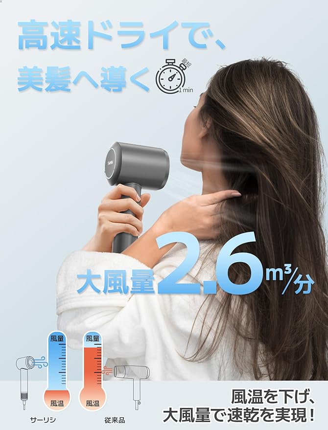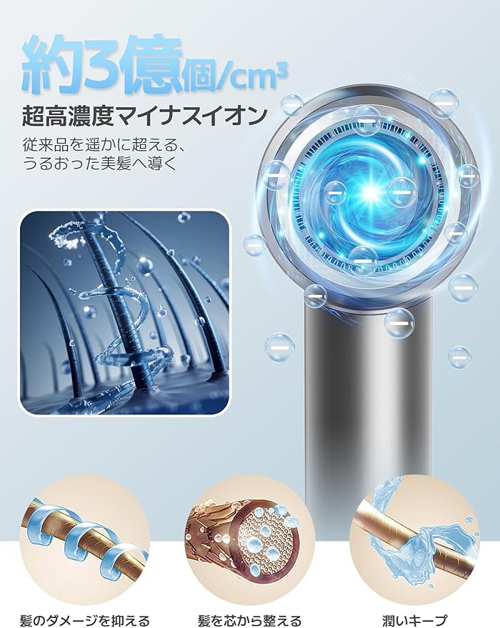 「3億個の高濃度マイナスイオン&静電気抑制」本製品は、マイナスイオンで髪を守りながら潤いを与えて、大風量で乾かす速乾ドライヤーです。内蔵されている3億個のマイナスイオン発生装置によって、マイナスイオンを大量に放出させることで、静電気の発生を最大限抑制します。そのため、ロングヘアの場合でも、パサつく髪や枝毛などを改善させて、つやのある髪に導きます。また、ドライヤーの温風によるダメージも軽減し、髪を乾かしすぎることによって水分不足になるのを防ぎ、ダメージを受けた髪のキューティクルを、マイナスイオンの