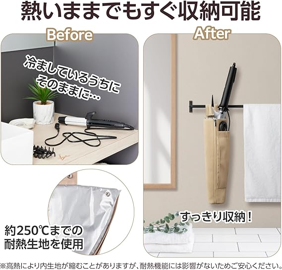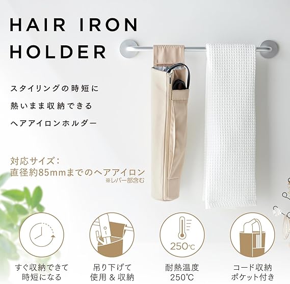 アツアツのヘアアイロンをそのまましまえるヘアアイロンホルダーです。髪を巻いたらすぐにしまって即出勤OK。バタバタする毎朝のスタイリングを時短できます。