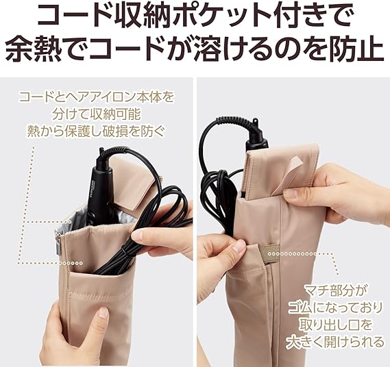 耐熱温度が約250度だから、ヘアアイロンが冷めるまで待つ必要がなく、使用した直後でも収納できます。スタイリング中の一時置きにも便利です。