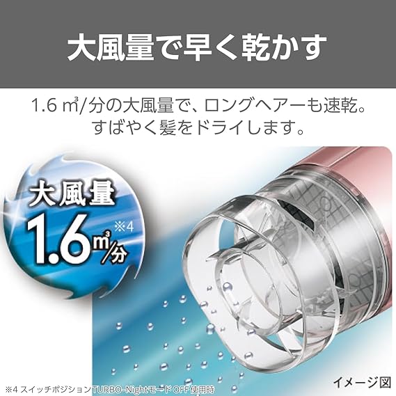 静かに乾かしたいときは[ NIGhTモードスイッチ ]をONに。低騒音化構造による業界トップクラス※3低騒音50DB※1で、周りを気にせずに髪の毛を乾かすことができ、夜でも安心してお使いいただけます。※1 スイッチポジション TURBO / NIGhT モード ON 使用時※3 2018年10月現在、当社調べ(家庭用ヘアードライヤーにおいて)*当社従来機種TID930約70DBとTID730約50DBの比較。
