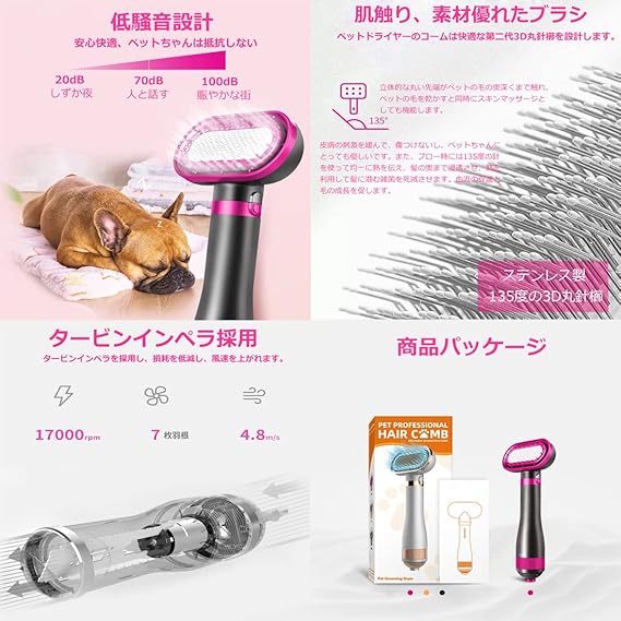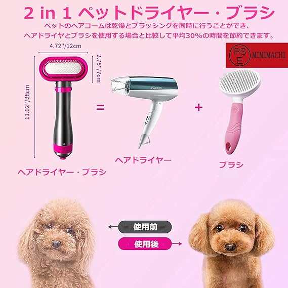 【最新改良版2IN1機能ペットドライヤー】:ヘアドライヤーとブラシ2 in 1機能、片手でも簡単に操作できます!!! ブラシ付きのペットドライヤーはペットの毛の奥まで乾き、ペットの抜け毛をきれいに梳かしながら、ペットをマッサージもできます。 ブラシには細くて円形の針先を採用、肌に優しく、ペットの毛をふわふわ滑らかになります。