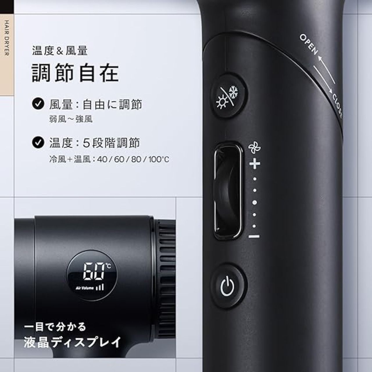 【液晶画面付き】 使用中の温度と風量が一目でわかる液晶画面付き。押し/スライドボタンのみで操作・確認する他社製品も多いため、現在の温度や風量がわかりにくいストレスが軽減されます。