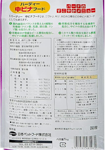 4~10週齢の中ビナに適したフード「バーディー 中ビナフード 1kg」