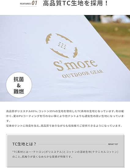 【高品質のポリコットン生地/ UPS50+】 コットン35%、ポリエステル65%、ポリコットン(TC)の生地は、 普通のテントとは違った柔らかい手触りが特徴的。 通気性、吸湿性があり夏は涼しく、冬は暖かい。 生地は、難燃性、抗菌効果、UVカットもあり、お手入れしながら、安心して長い期間ご使用いただけます。