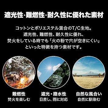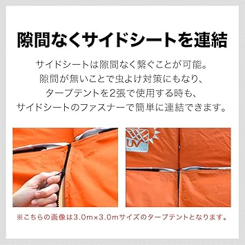 【日よけやお隣のテントとの仕切りに最適!】 3.0mタープテント専用のサイドシートにT/C(ポリコットン)タイプが登場です。日よけやお隣との仕切りとしても使用できます。 ※スチール製・アルミ製フレーム共通 【遮光性・難燃性・耐久性に優れた素材】 コットンとポリエステル混合のT/C生地。遮光性、難燃性、耐久性に優れ、 焚火をしている時でも「火の粉で穴が空きにくい」と
