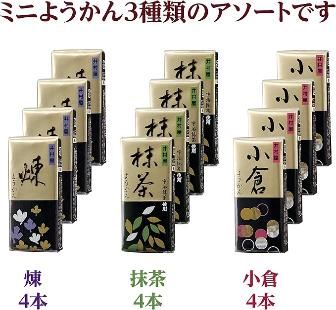 原材料:ようかん煉[砂糖、生あん、水あめ、寒天、食塩] ようかん小倉[砂糖、小豆甘納豆、生あん、水あめ、寒天、食塩] ようかん抹茶[砂糖、生あん、水あめ、寒天、抹茶、食塩、クチナシ色素]