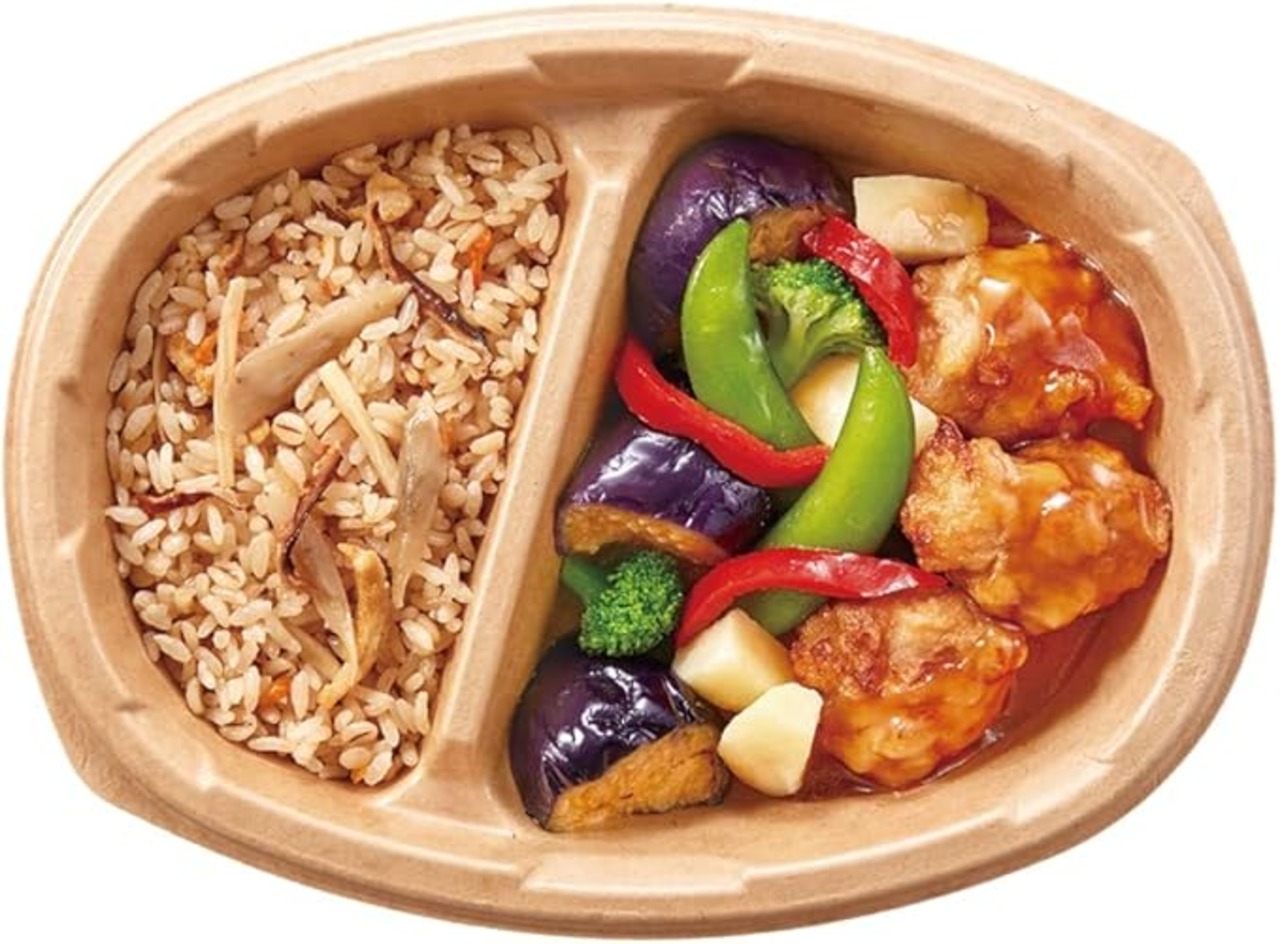 13品目の食材使用。五目ご飯と酸味を効かせつつまろやかな鶏の黒酢あんのセット。