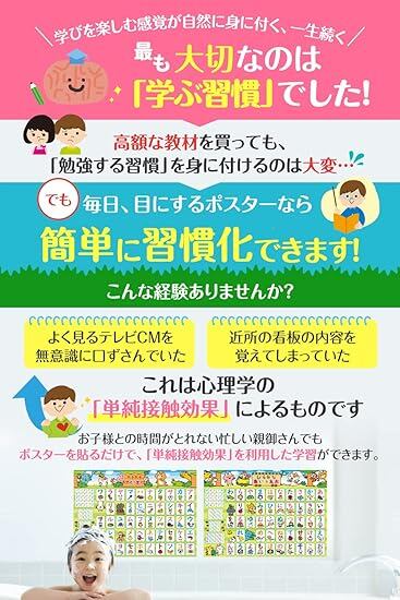 【学ぶ習慣が身に付く】このポスターは、よく目にするテレビ CM や広告を無意識に覚えてしまう 「単純接触効果」をお子様の言語習得に活用し、 貼るだけで忙しい毎日でも言語学習ができ学びの習慣が身につくアイテムです。
