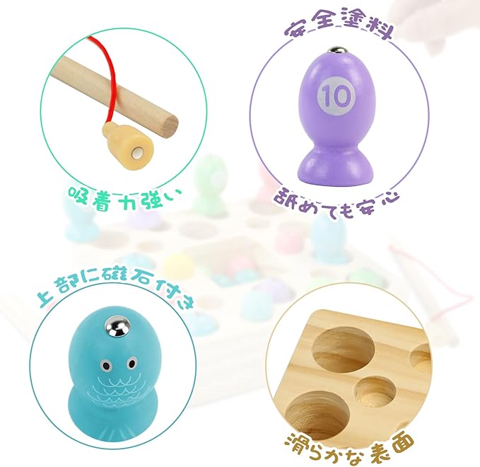 【モンテッソーリ魚釣り玩具】この木製知育玩具は、コンパクトに整理され、カラフルで様々な形があり、子供の視覚、色彩認識、想像力を刺激します。また、この子供用玩具は、年齢によって難易度の異なる教え方を選ぶことができます。 子供たちは、小さいうちは順序を、大きくなったら数を学び、掛け算や割り算も身につけることができるので、長い間遊べる玩具として最適です。教室の教材として、また学校での授業の補助としても最適です。このモンテッソーリの玩具も、様々な遊び方があり、子供たちの探求と発見を待っています。