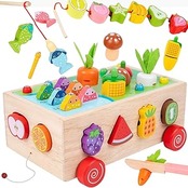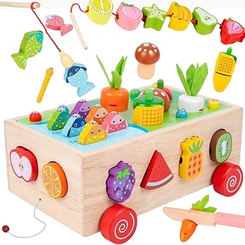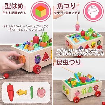 【多機能で長く遊べる】このモンテッソーリ知育おもちゃは、型はめ、魚釣り、昆虫つり、野菜収穫、おままごと、糸通し、車でのおでかけの7種類の遊びが楽しめます。車の中におもちゃを収納できるので、片付けも簡単。木製の温かみとカラフルなデザインで、インテリアとしても魅力的です。
