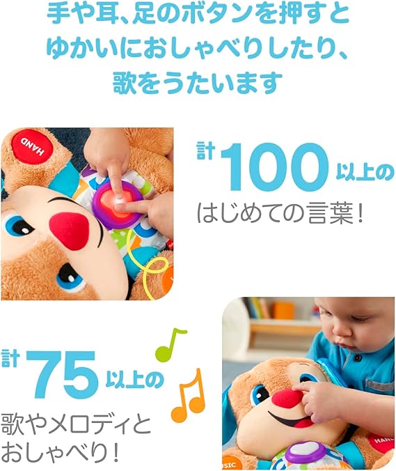 【内容】わんわんは、歌やおしゃべりが大好き!遊びながら楽しく学べます。やわらかくてぎゅーっとしたくなるわんわんは、いつもいっしょに連れていきたいおともだち!100の言葉、75以上の歌やサウンドを収録した知育の学びがいっぱい。 レベル1—たのしもう! 6カ月~ 手、足、おなか、ハートのボタン、耳を押すとおしゃべりします。レベル2—やってみよう! 12カ月~ おなかはどこかな?手はどこ?わんわんがクイズを出すよ!レベル3—まねっこしてみよう! 18カ月~ わんわんと一緒にごっこ遊びをしよう!わんわん