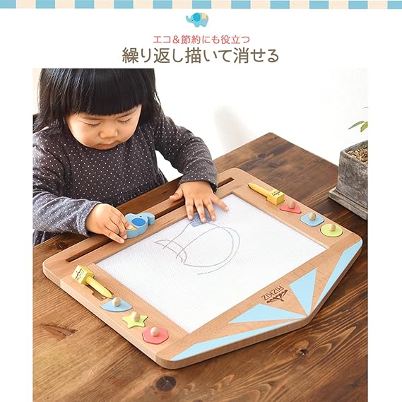 【繰り返し描いて消せる】 ボードに付いているぞうさんをスライドさせると描いた絵が消え、繰り返しお絵かきできます。エコ&節約にもなり、クレヨンや絵の具で身の回りが汚れる心配がありません。 【知育おもちゃとしても活躍】 お絵かきはもちろん、お
